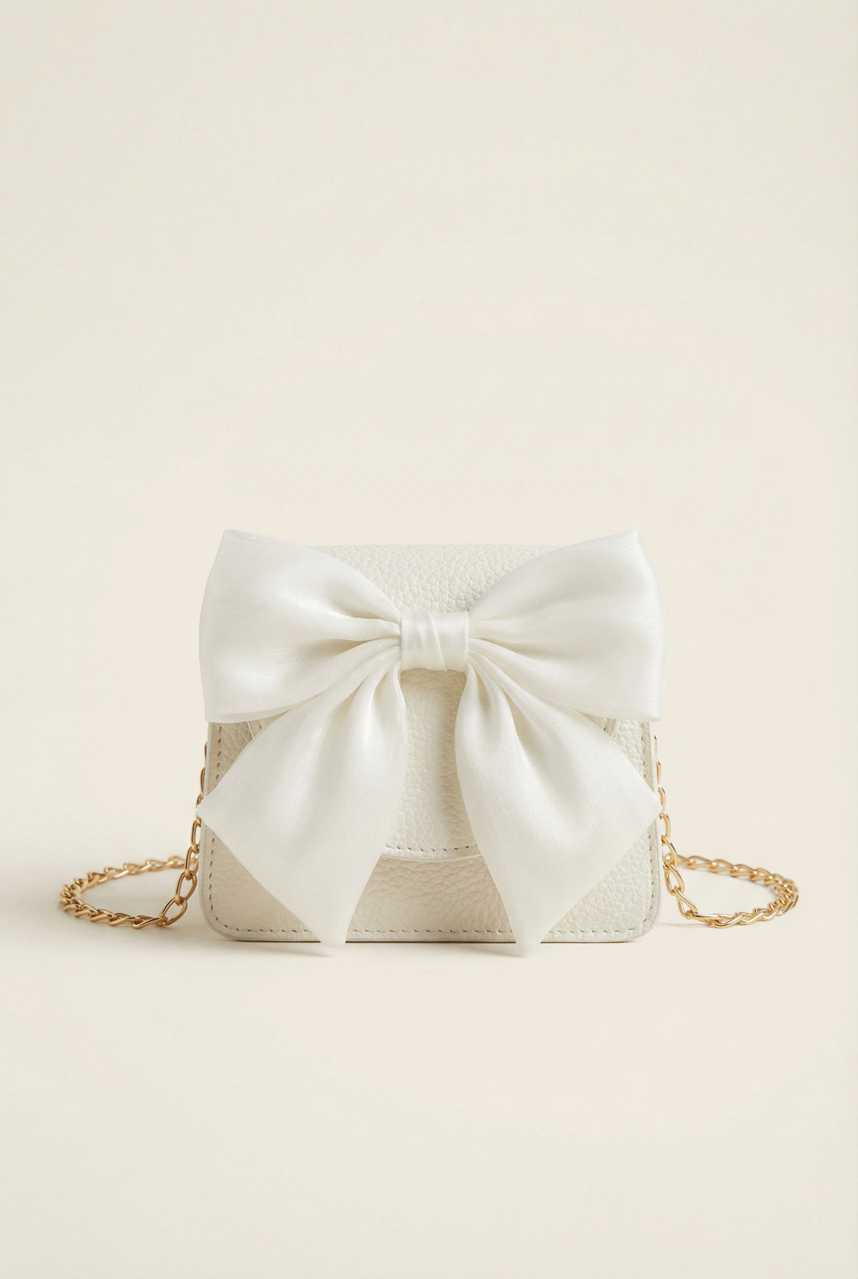 Елегантна бяла чантичка с панделка и златна верижка за момиче